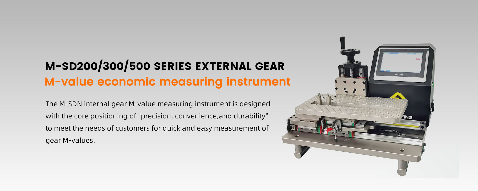 The M-SD external gear M-value measuring instrument is designed with the core positioning of "precision, convenience, and durability" to meet the needs of customers for quick and easy measurement of gear M-values. The device is equipped with a PLC system that displays measurement data in real-time; Equipped with high-precision grating ruler counting, no need for standard component zerocalibration;Theplatformcanbequicklyreplacedtomeasuregearsofdiferentspecifications;Handcrankedmanual fixed-point lifting and measuring platform, with pointers indicating the position of the ruler for easy recording of the measurement position. Suitable for measuring most high-precision gears.
